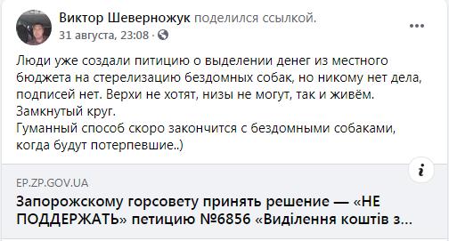 Уже даже создана петиция о выделении денег на стерилизацию бездомных собак. Но к сожалению за нее не спешат голосовать. В ней жительница Запорожья просит депутатов Запорожского горсовета на очередной сессии рассмотреть вопрос вакцинации и стерилизации бездомных собак и создание за счет местного бюджета приютов для бездомных животных.