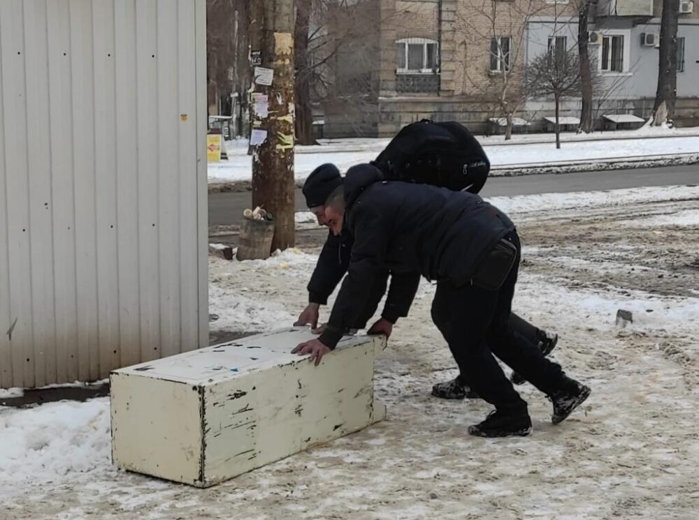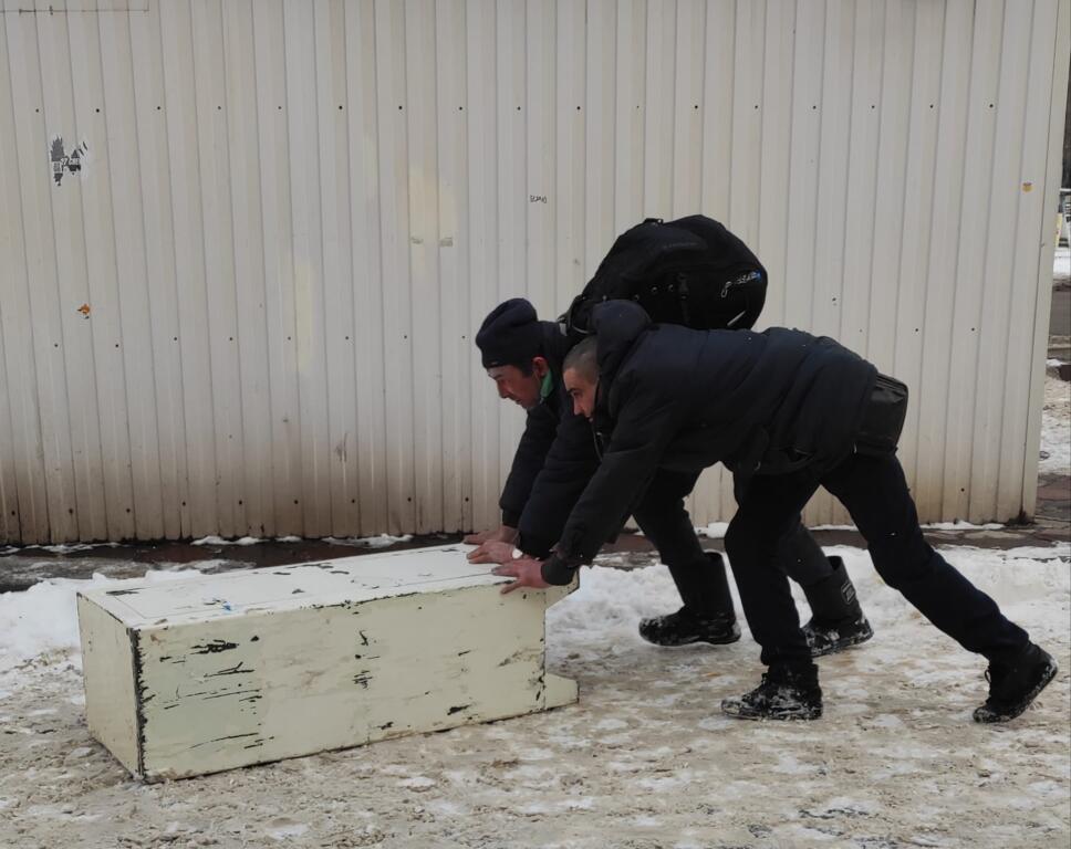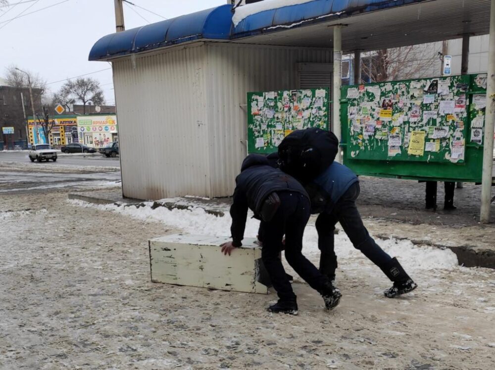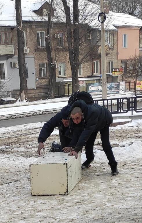 Мужчина где-то раздобыли железный сейф и решили его сдать на приёмку. Но так как транспортировать его не на чем, то местные алкаши толкали его до самого пункта. Благо погода им подсобила, лежал снег.