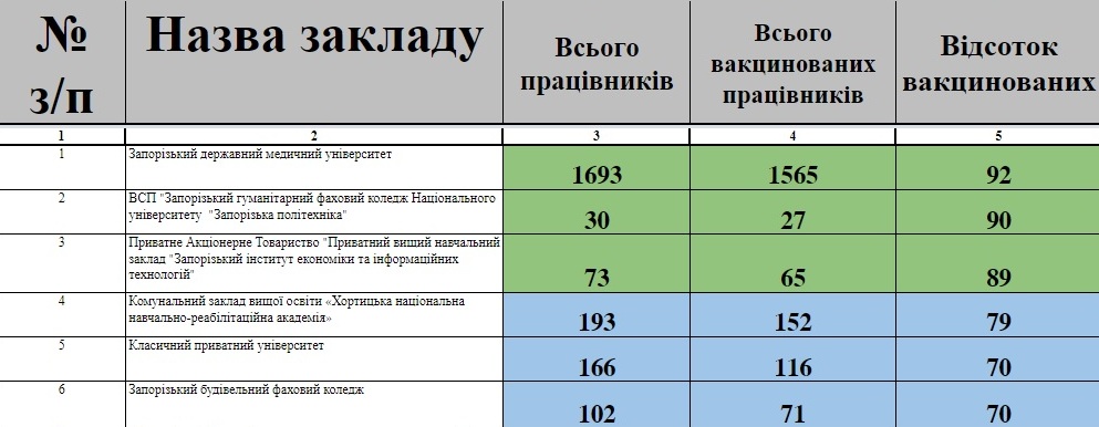 Однако отметим, что Запорожский национальный университет до сих пор продолжает работать, несмотря на низкий процент вакцинированных преподавателей.