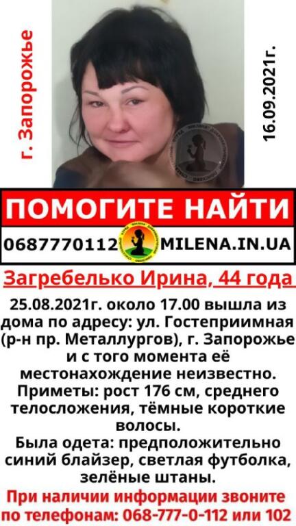 25 августа около 17.00 Загребелько Ирина вышла из дома и с того времени о ней ничего неизвестно.