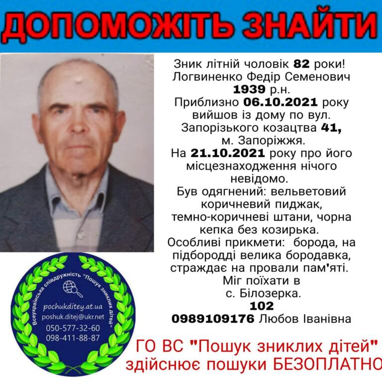 Как сообщает Всеукраинское содружество “Поиск пропавших детей”, Логвиненко Федор Семенович приблизительно 6 октября ушёл из дома по ул. Запорожского казачества, 41. На сегодняшний день о его местонахождении ничего неизвестно.
