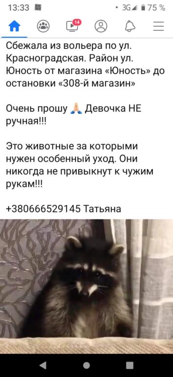 Так хозяйка енота просит помощи в поисках своего домашнего любимца. Енот девочка, не ручная, требует особого ухода. Если кто увидит просьба позвонить по телефону указанному в объявлении.