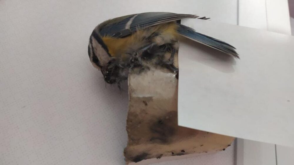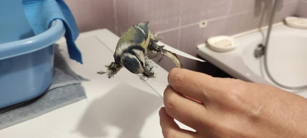 Из-за безалаберности жителей, чуть не погибла лазоревка. Бедную птичку Татьяна увидела в окно, та сначала махала крыльями, а потом просто отчаянно клевала что-то вокруг себя. Видно было, что лазоревка к чему-то приклеилась и не может улететь.