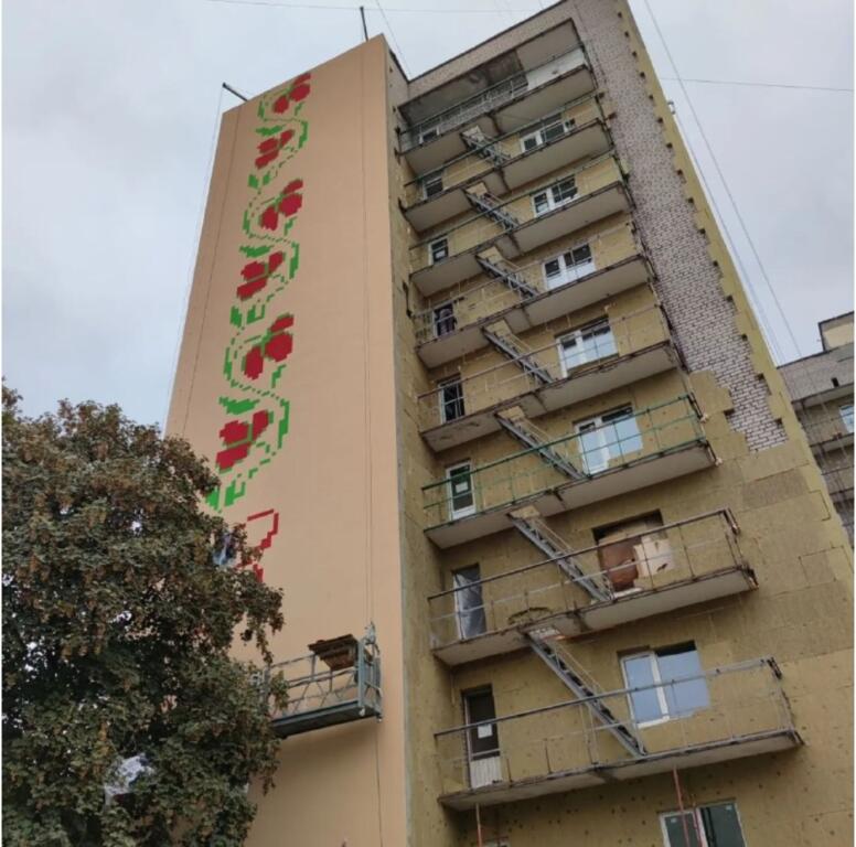 Фасад студенческого общежития ЗНУ ремонтируют – утепляют и красят. Сплошную стену решили украсить. Так, на стене уже можно увидеть мурал в виде вышивки. Цвета выбрали символические – красный и зеленый. Рисунок имитирует вышивку клетками.