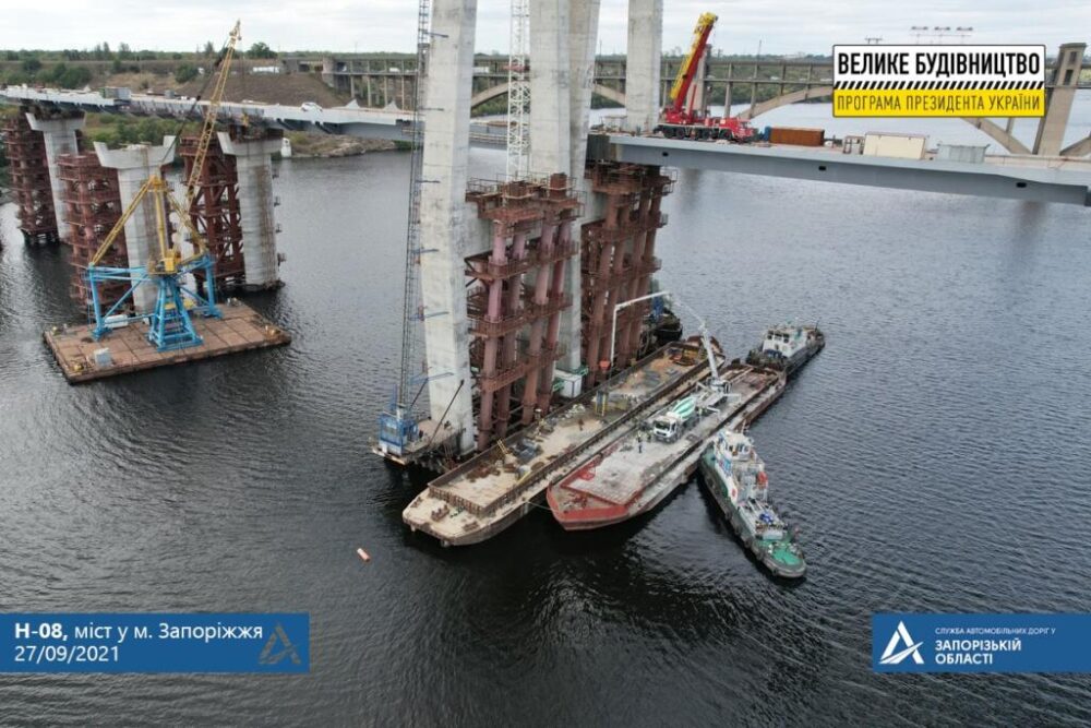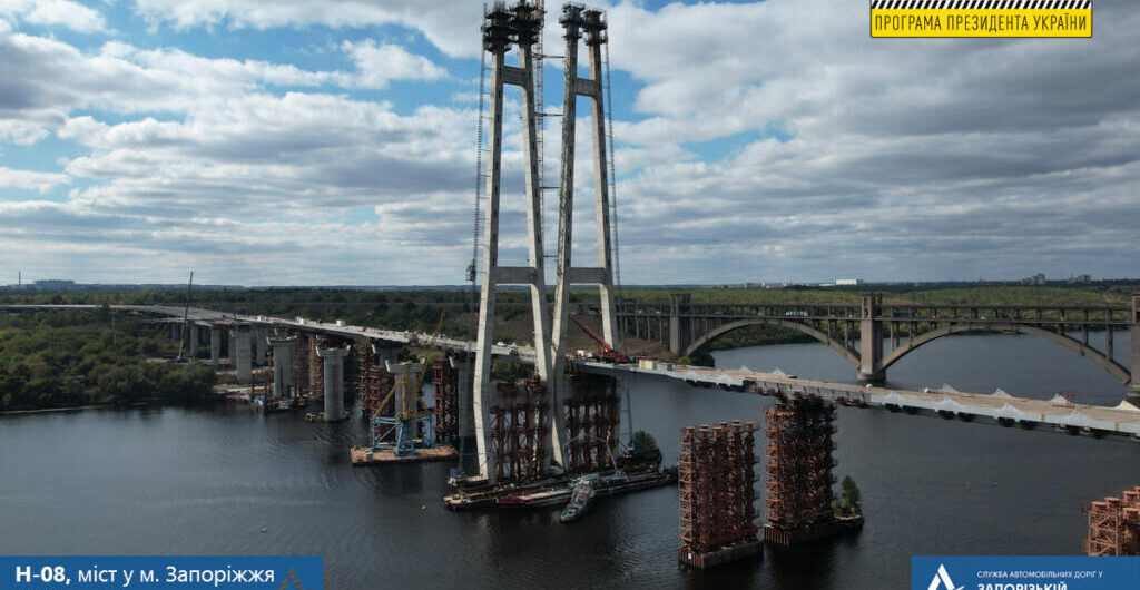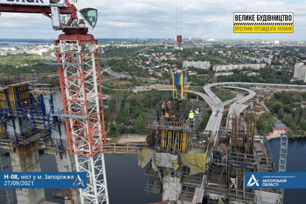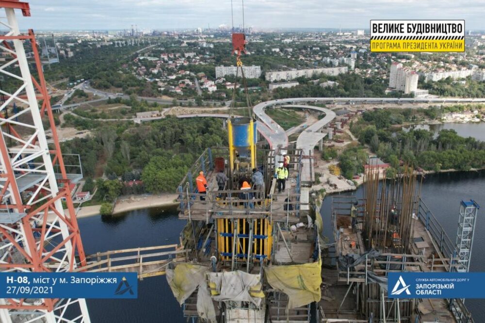 27 сентября, мостостроители начали бетонирование пилона низовой части вантового моста, который соединяет остров Хортица с левым берегом.