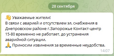 «Уважаемые жители! В связи с аварией и отсутствием эл. снабжения в Днепровском районе г.Запорожье Контакт-центр 15-80 временно не работает, до устранения аварийной ситуации.