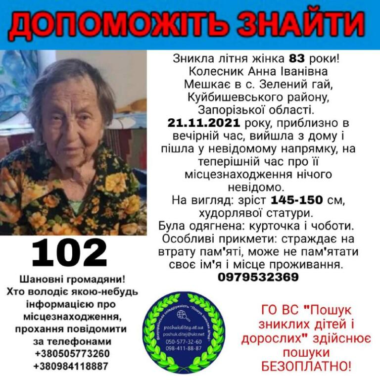 В с.Зеленый гай, Куйбышевского района, Запорожской области пропала 83-х летняя Колесник Анна Ивановна. Об этом сообщает ВС “Поиск детей”.