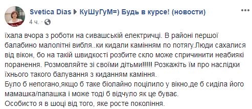 В четверг, 2 августа, под Запорожьем в районе Балабино, дети забросали движущуюся электричку камнями.