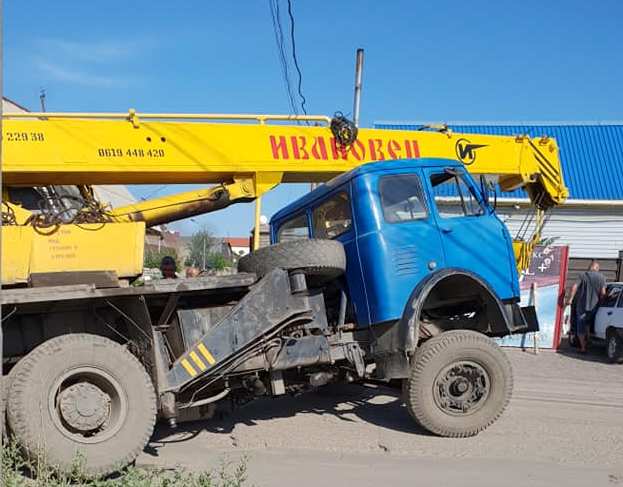 На фото видно, как кран оказался задним колесом в яме.