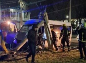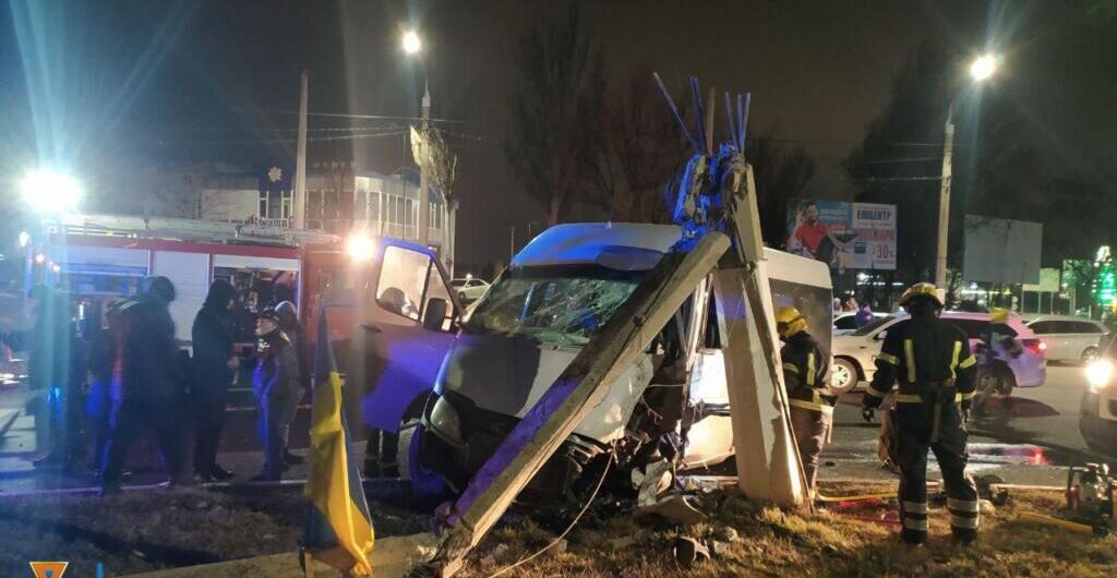 На Южном кругу автомобиль «Mercedes-Benz Sprinter» влетел в столб. Водителя зажало в покорёженной маршрутке. А электроопору согнуло пополам.
