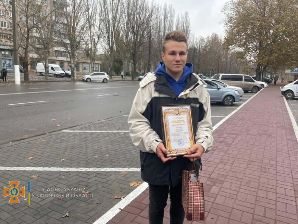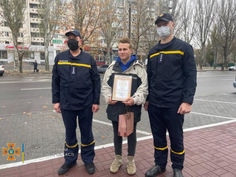 Героизм Александра Оганьяна подтверждают и профессиональные спасатели. Начальник 3 Государственного пожарно-спасательного отряда Александр Баша вручил новоиспеченному спасителю Грамоту от начальника Главного управления ГСЧС Украины в Запорожской области генерал-майора службы гражданской защиты Алексея Лепского. А также юный помощник спасателей получил ценный подарок. Александр, в свою очередь, как и все настоящие герои, оказался парнем очень скромным и не ожидал такого внимания.