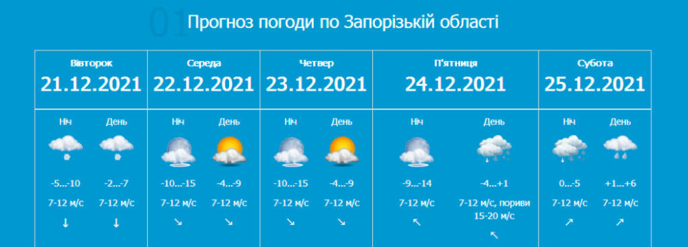 Запорожский областной центр гидрометеорологии сообщает: завтра, 21 декабря, на территории Запорожской области ожидается понижение температуры.