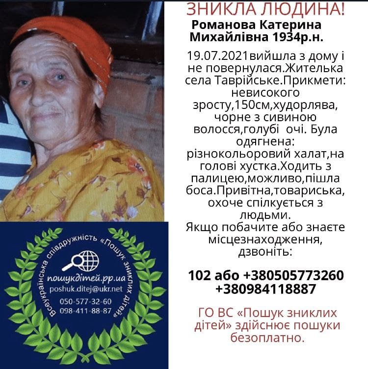 Романова Катерина Михайловна 1934 года рождения проживает в селе Таврическое. 21 июля она вышла из дома и не вернулась.