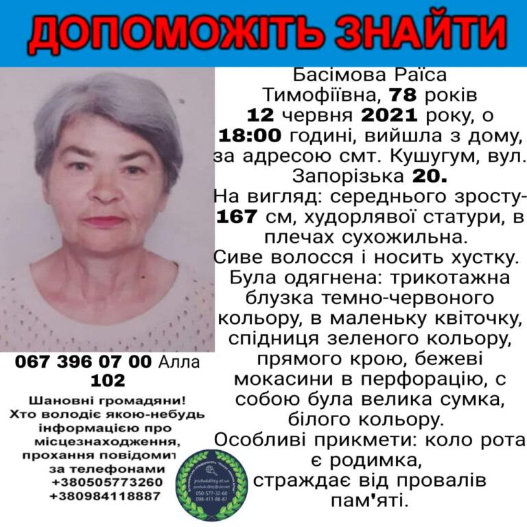 В пгт.Кушугум ушла из дома 78-ми летняя женщина и не вернулась.