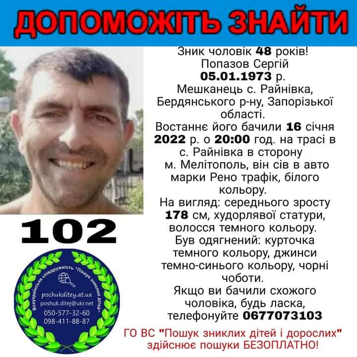 16 января после 20:00 Попазова Сергея вывез житель села Райновка на трассу. Мужчина посадил 49-ти летнего Сергея на проходящий мимо белый микроавтобус “Фольксваген”. Он собирался ехать в Мелитополь. Но с этого дня Попазова никто не видел и его телефон выключен.