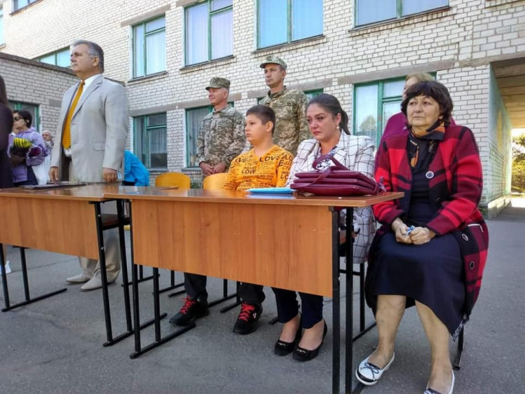 На торжественной линейке по случаю открытия доски, кроме школьников и учителей, присутствовали мать, жена и сын погибшего Героя.