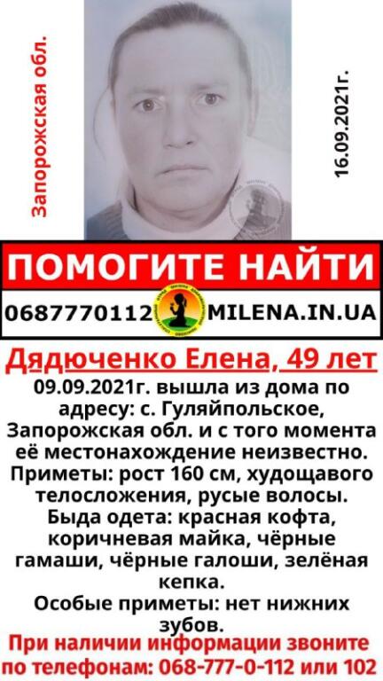 UPD. Как сообщает ВП№1 (Гуляйполе) Пологовского РВП ГУНП, пропавшая Дядюченко Елена Викторовна, 21.08.1972 г.р.,  склонна к бродяжничеству. Женщина была в состоянии «белой горячки» в связи со злоупотреблением алкоголем.