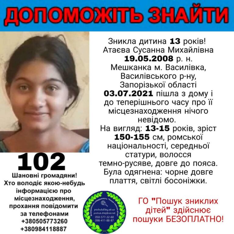 Как сообщает всеукраинское содружество “Поиск пропавших детей”, Атаева Сусанна Михайловна проживает в г.Васильевка. Она ушла из дома еще 3 июля этого года и до сих пор о ней ничего неизвестно. Девочке всего 13 лет.