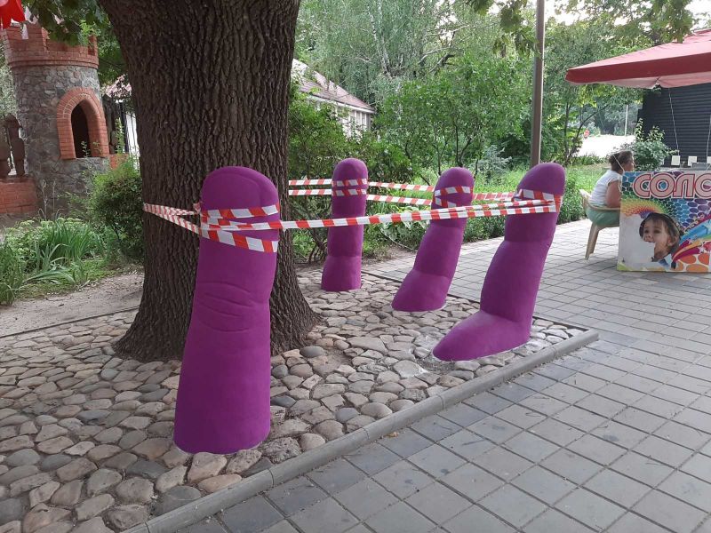 Странный арт-объект был установлен в 2019 году в Мелитопольском городском парке. Теперь торчащие из-под земли огромные бетонные пальцы – стал ещё более странным. Их покрасили в лиловый цвет.