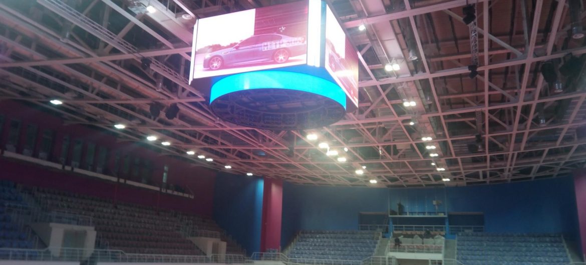Это оборудование было изготовлено словацкой фирмой, ее же специалисты занимаются монтажом. Медиакуб представляет собой четырехсторонний экран и подвешен под потолком на высоте 7 метров над центром площадки. Площадь каждой стороны – 4 кв. м. Экраны и медиакуб будут использоваться для показа видеоповторов игровых моментов, эмоций болельщиков, спортсменов и тренеров, а также клипов. На экраны будет выводиться информация о счете, игровом времени, разнообразная статистика.
