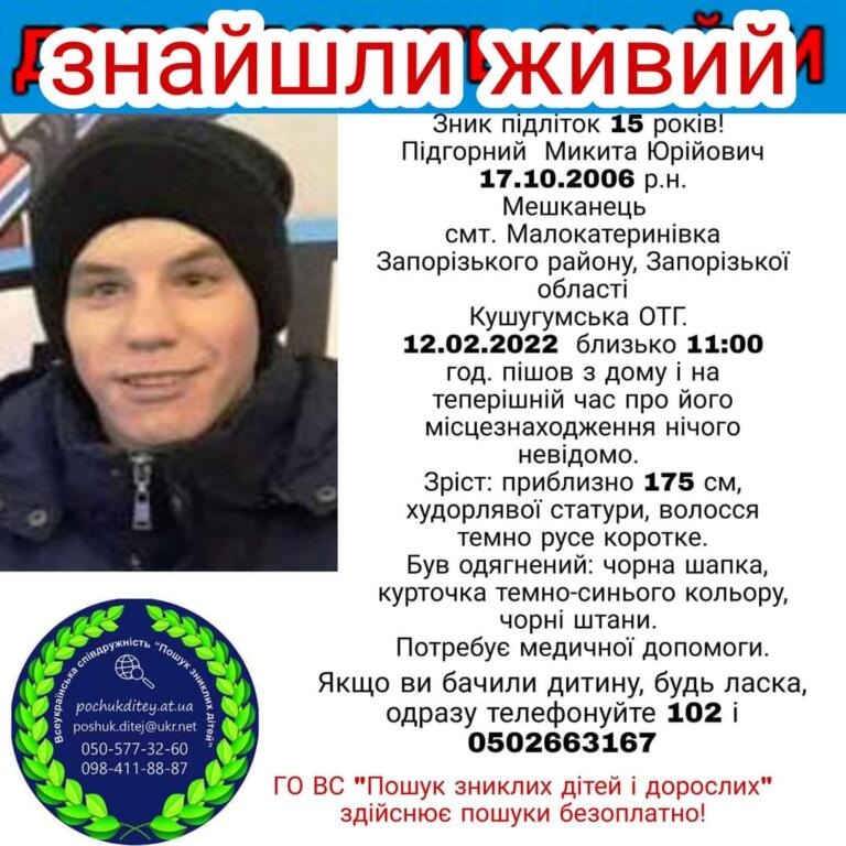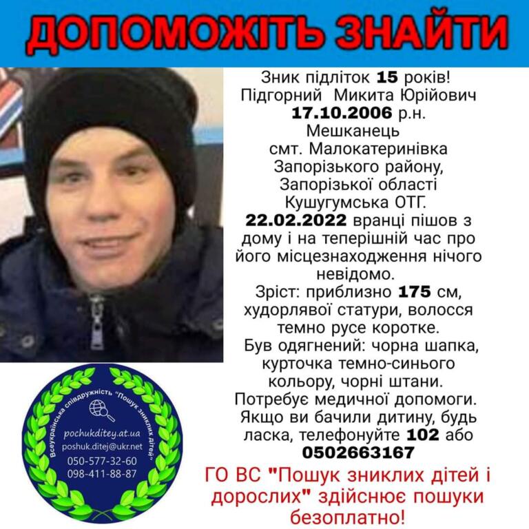 Как сообщает ОО “Поиск пропавших детей в Запорожской области”, Подгорный Никита Юриевич 22 февраля ушел из дома в смт. Малое Катериновка, и на данный момент его местонахождение неизвестно.
