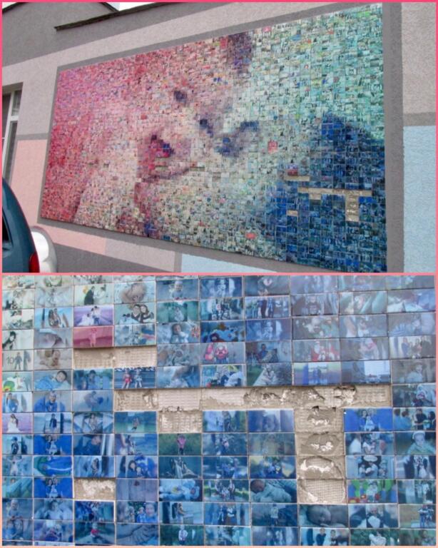 Посетители больничного городка обратили внимание, что арт-объект лишился пару десятков керамических плиток. Кстати панно презентовали накануне Дня города. Каждая плитка – это семейный снимок кого-то из мелитопольцев, присоединившихся к акции по созданию арт-объекта. Это большой рисунок в виде матери и ребенка, который состоит из множества маленьких. Фрагменты подобраны по цвету