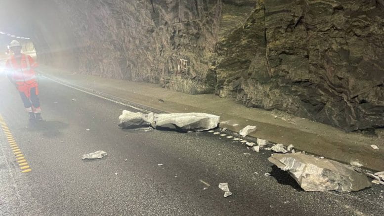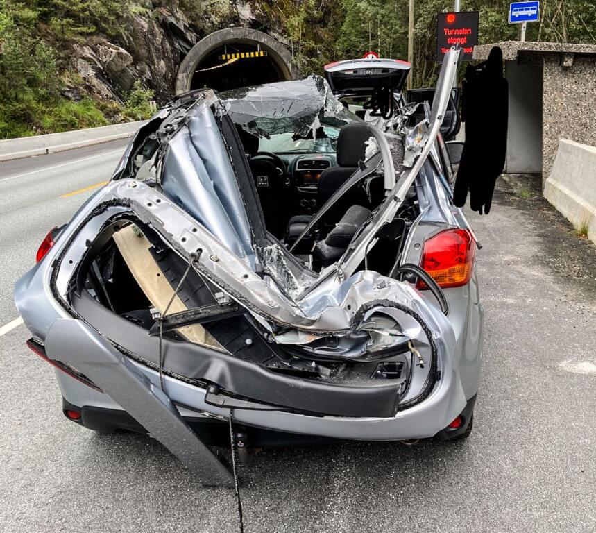 В Норвегии в автомобильном тоннеле Тродаль большой камень, сорвавшийся сверху, упал на легковой автомобиль и проломил его крышу.