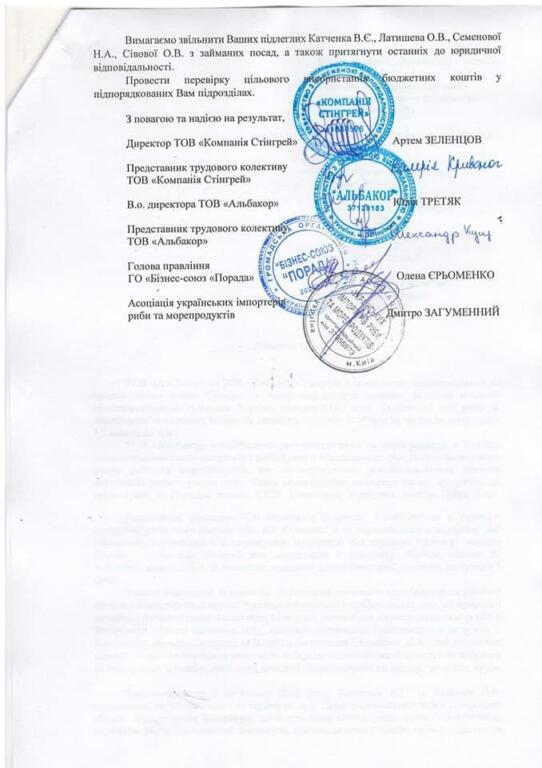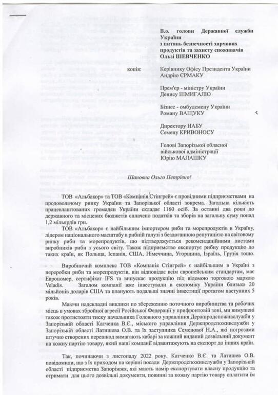У зв’язку з чим, не погоджуючись з запропонованою Катченком В.Є. та Латишевим О.М. корупційною схемою та розуміючи злочинну складову такої діяльності, підприємства вимушені оформлювати дозвільні документи на експорт продукції у інших областях України, а саме у Головному управління Держпродспоживслужби у Рівненській області та Головному управлінні Держпродспоживслужби у Черкаській області»-йдеться у повідомленні. Відкритий лист з закликом про допомогу у боротьбі проти корупції компанії направили до голови Запорізької області, очільника офісу президента, голови НАБУ, та бізнес-омбудсмена України.