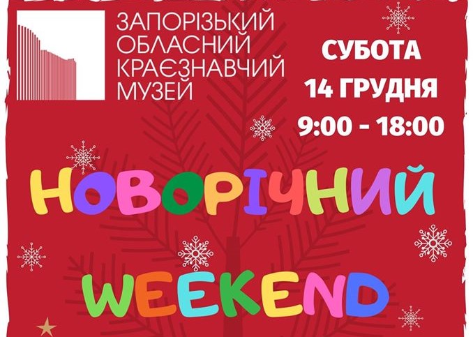 Познавательно-развлекательная программа «Новогодний weekend» состоится 14 декабря с 10.00 до 18.00. В музее на разных локациях будут работать выставки-ярмарки новогодних украшений от мастеров ОО «Запорожский колорит» и мастерской «Добрая глина» (г. Пологи), также мастер-классы по изготовлению традиционных сувениров, подарков и украшений.