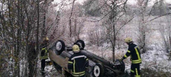 Водитель автомобиля «ВАЗ 21099» на скользкой дороге не справился с управлением, и съехал в кювет где врезался в дерево. Прибыв на место происшествия, спасатели обнаружили пассажира которого зажало искореженными конструкциями автомобиля.