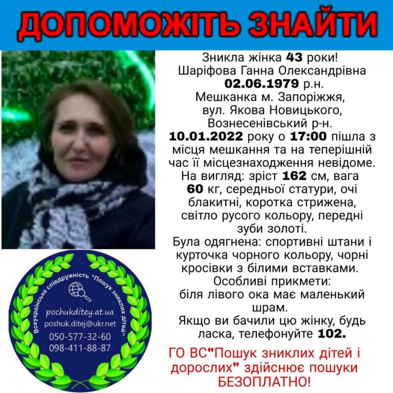 Об этом сообщает Всеукраинское содружество “Поиск пропавших детей”. Шарифова Анна Александровна пропала 10 января в 17:00. Она ушла из дома и до сих пор о ней ничего неизвестно. Проживает Анна на ул.Якова Новицкого в Вознесеновском районе.