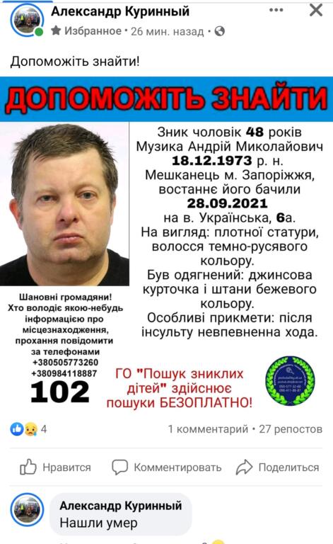 Так, волонтеры ОО” Поиск пропавших детей” разместили ориентировку о пропаже 48-летнего Музыки Андрея Николаевича, которого последний раз видели 28 сентября на улице в. Украинской.